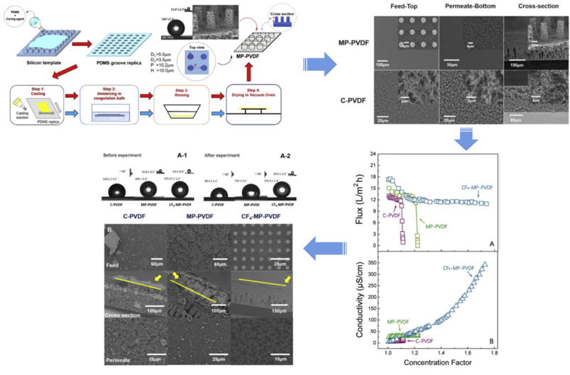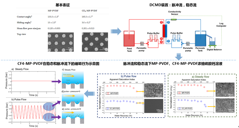 1.采用微模塑相分离方法设计了一种超疏水聚偏氟乙烯(PVDF)微米柱阵列膜(MP-PVDF),膜的接触角为166.0o,滚动角15.8o。经过四氟化碳(CF4)等离子体处理后,所得膜(CF4-MP -PVDF)的滚动角减小到3.0o,表现出优异的疏水性和耐结垢性能,顺利获得热力学分析得出矛盾,从水力学角度出发,提出润湿状态在耐结垢方面的重要作用。相关成果以“Slippery for scaling resistance in membrane distillation: A novel porous micropillared superhydrophobic surface”和“Scaling mitigation in membrane distillation: From superhydrophobic to slippery”为题分别发表在Water Research 和Desalination上。(图1和图2)