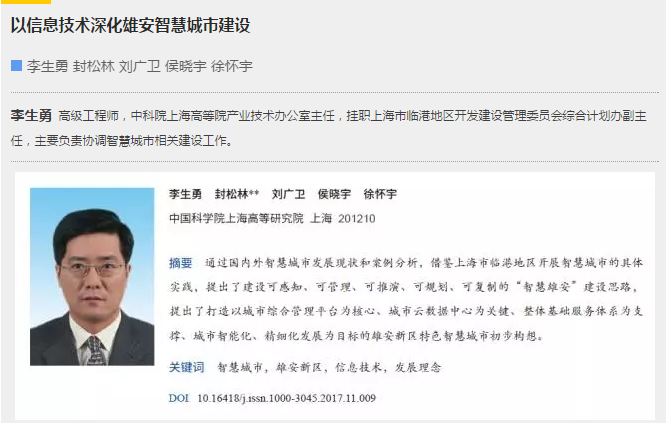 高研院《以信息技术深化雄安智慧城市建设》的论文在《中国科研实验室院刊》上发表