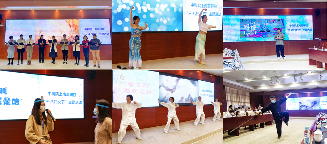本次线上+线下的活动形式新颖,气氛轻松愉悦。高研院首位“上海市三八红旗手”周婷研究员作为女科学家代表,在科技系统做了《闪亮的选择》云端情景演讲。高研院妇委会委员集体朗诵《没有你,万般精彩皆枉然》,院“凌云芳妍”舞蹈社成员张斯颖、杨晨璐表演傣族舞蹈《玲》,高研院首届“青春闪耀我有我的young”歌神争霸赛冠军宋雪朝献唱《好好》,其间穿插丰富多彩的趣味游戏将活动推向高潮。最后出场的院太极社更是带来精彩展示,社员代表刘浩飞、刘巧玲、姚盼盼、许春玲带动全场一起学练健身气功《八段锦》,徐加强一套“太极剑”舞得虎虎生风,为整场活动画下了圆满句号。